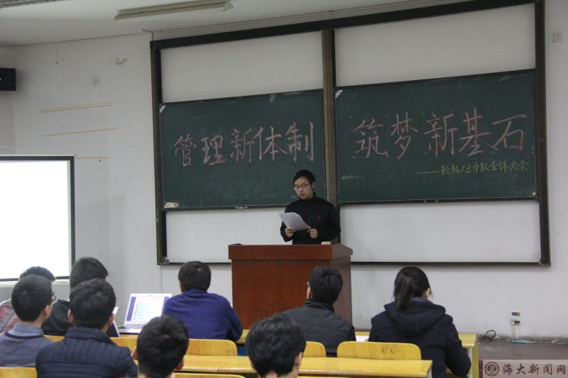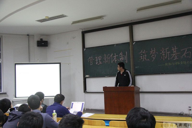 4月19日,轮机工程学院轮陆2013中队在远航楼101召开了本学期第一次中队大会,会议主题为“管理新体制,筑梦新基石”,指导员及中队全体学生参加了本次会议,会议由副中队长金晨阳主持。