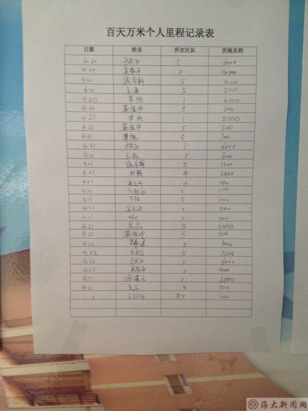 “百天万米计划”里程累加来源分为两个方面: 一则为常规晨练,由副中队长张浩然同学组织,每天早晨6点从海华十一公寓开始,途经八公寓、远航楼、综合楼直至返回起点完成全部里程,到达终点后由中队纪检成员统计各班完成情况,全员完成的区队获得1500米里程累计,未能达标的区队每人次扣除50米里程;二则为个人锻炼,为了提升同学锻炼的积极性,鼓励学生制定个人运动计划,“百天万米”计划规定区队同学自行锻炼所跑里程,以1:100的比例计入区队累计里程数,团总支负责记录并每日更新里程记录板。从计划实施至今,同学已经习惯于关注里程记录板,并不时两三人组团锻炼。部分同学最初因为生病没有参加晨练,痊愈后也会积极的投入到锻炼之中,来弥补之前扣除的里程数,跑步健身已成为常态并大有形成浪潮的趋势。截止至4月17日,“百天万米”计划第一期结果已出,其中1区队以10800米取得第一。中队对首个突破万米的区队给予了表彰,并将于4月20日开展第二期“百天万米”计划。